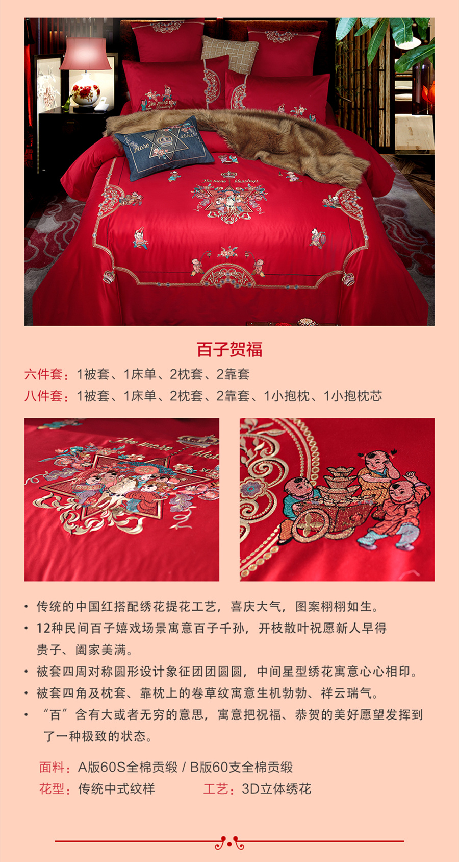 一套床品是結(jié)婚當(dāng)天使用,最好是采用大紅色進(jìn)行裝點(diǎn),紅色看上去會(huì)非常喜慶,而且可以納福辟邪,花型則多是選擇牡丹花、鳳尾花、百合花等花型紋樣,符合當(dāng)?shù)厝巳崦姥胖碌钠肺丁A硗鈨商状财肥窃诮Y(jié)婚后的兩三天使用,這些床品可以采用較溫馨的系列來裝扮(如粉色、紫色、金色),最后三到七套床品是常用款,就是日常換洗使用的購買簡(jiǎn)單大方樣式的床品即可。