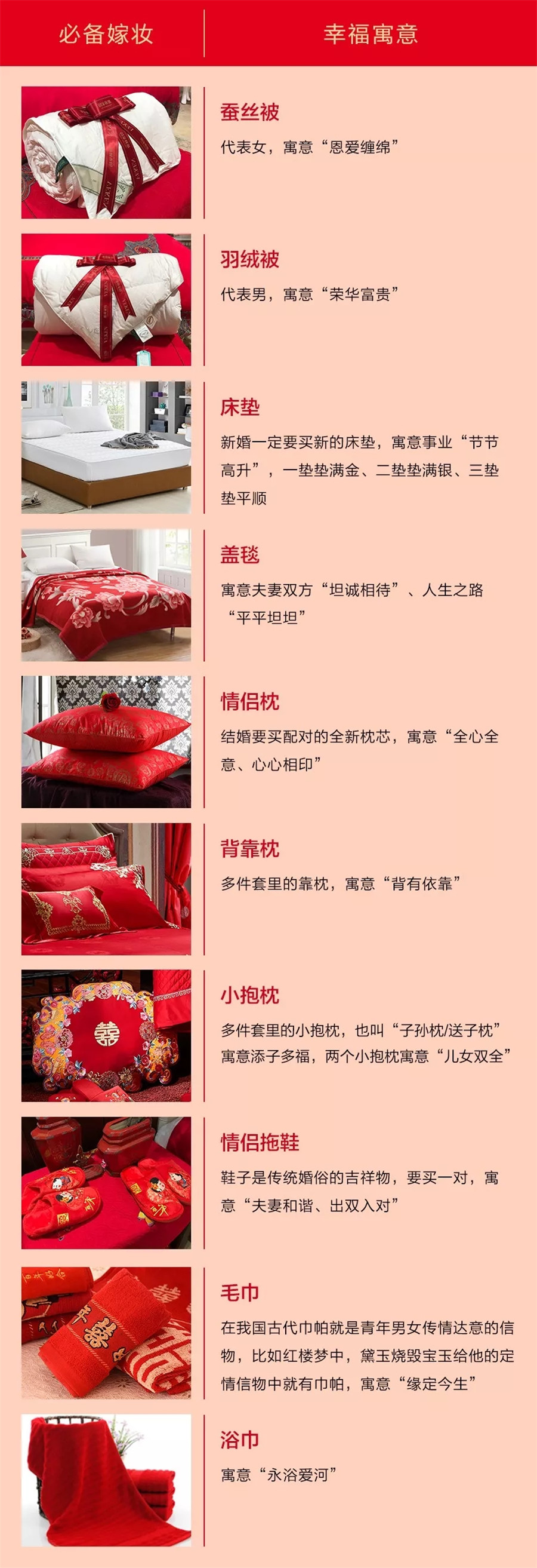 寓意“八穩(wěn)”的八鋪八蓋,承載了父母對(duì)新人濃濃的愛,同時(shí)也是對(duì)子女未來(lái)五谷豐登、榮華富貴的美好祝愿。